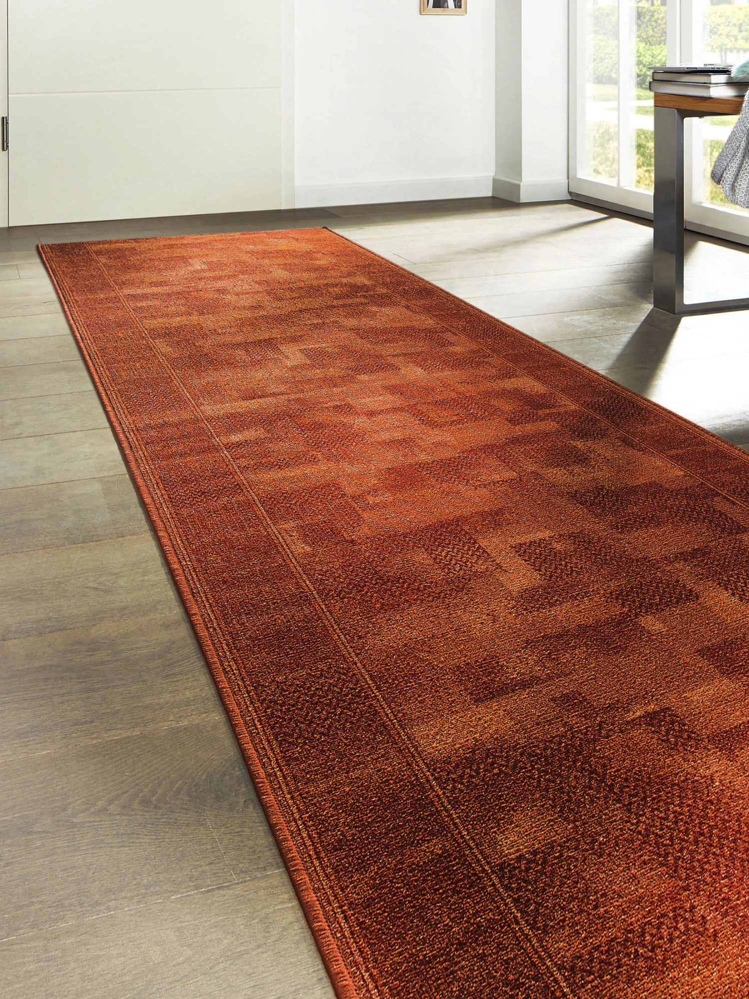 Strapazierfähiger Vintage-Läufer in harmonischer Farbkombination. Seitlich ist der Läufer mit farblich abgestimmtem Garn eingefasst. Gesamtgewicht ca. 1230 g pro m², Gesamthöhe ca. 5 mm, Flor aus 100 % Polyamid. Die Schnittkanten werden grundsätzlich mit passendem Garn umkettelt.