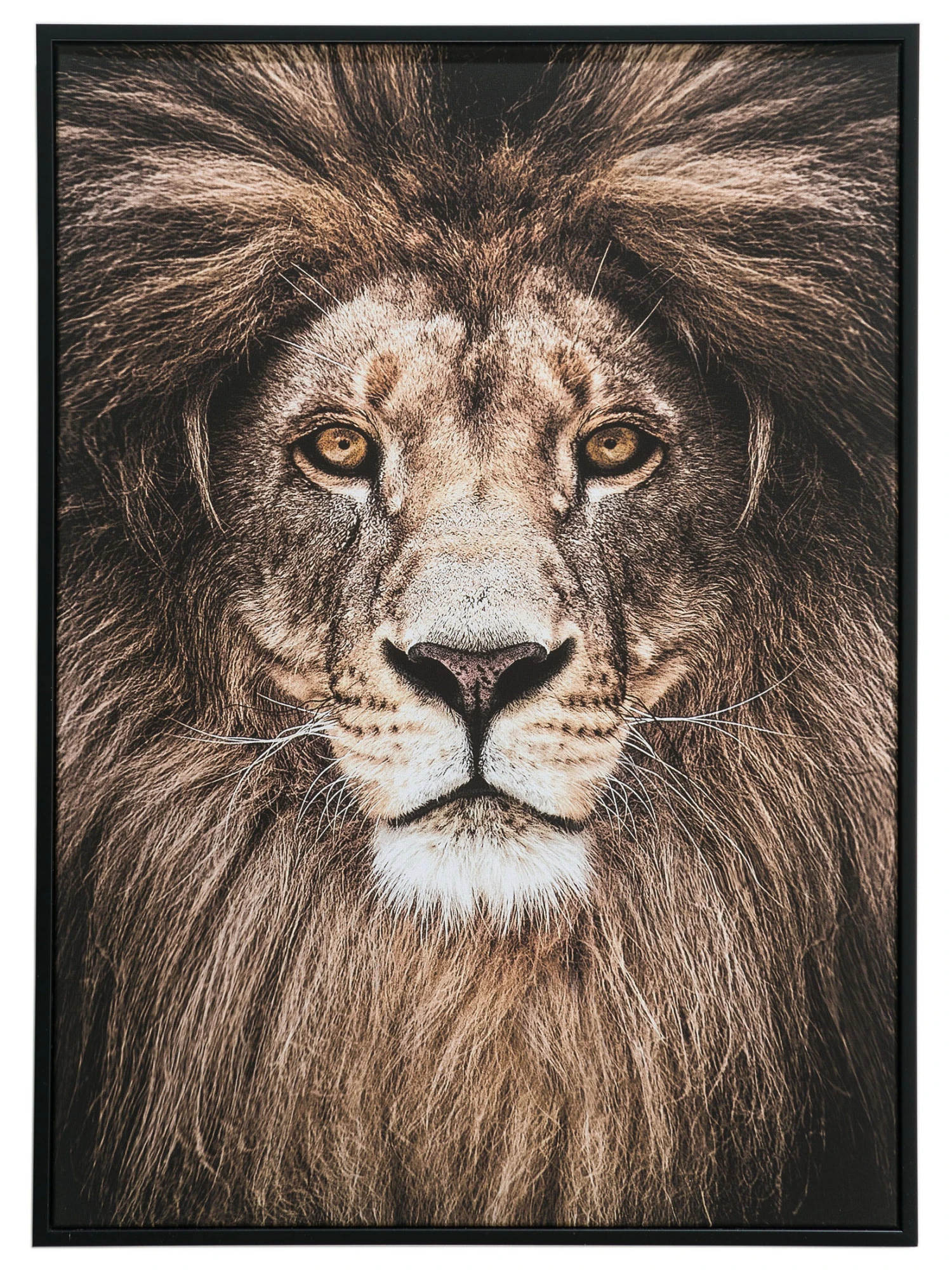 Majestätische Darstellung eines Löwen. Komplett mit passendem schwarzen Rahmen und schon montierter Aufhängung. Fotodruck.