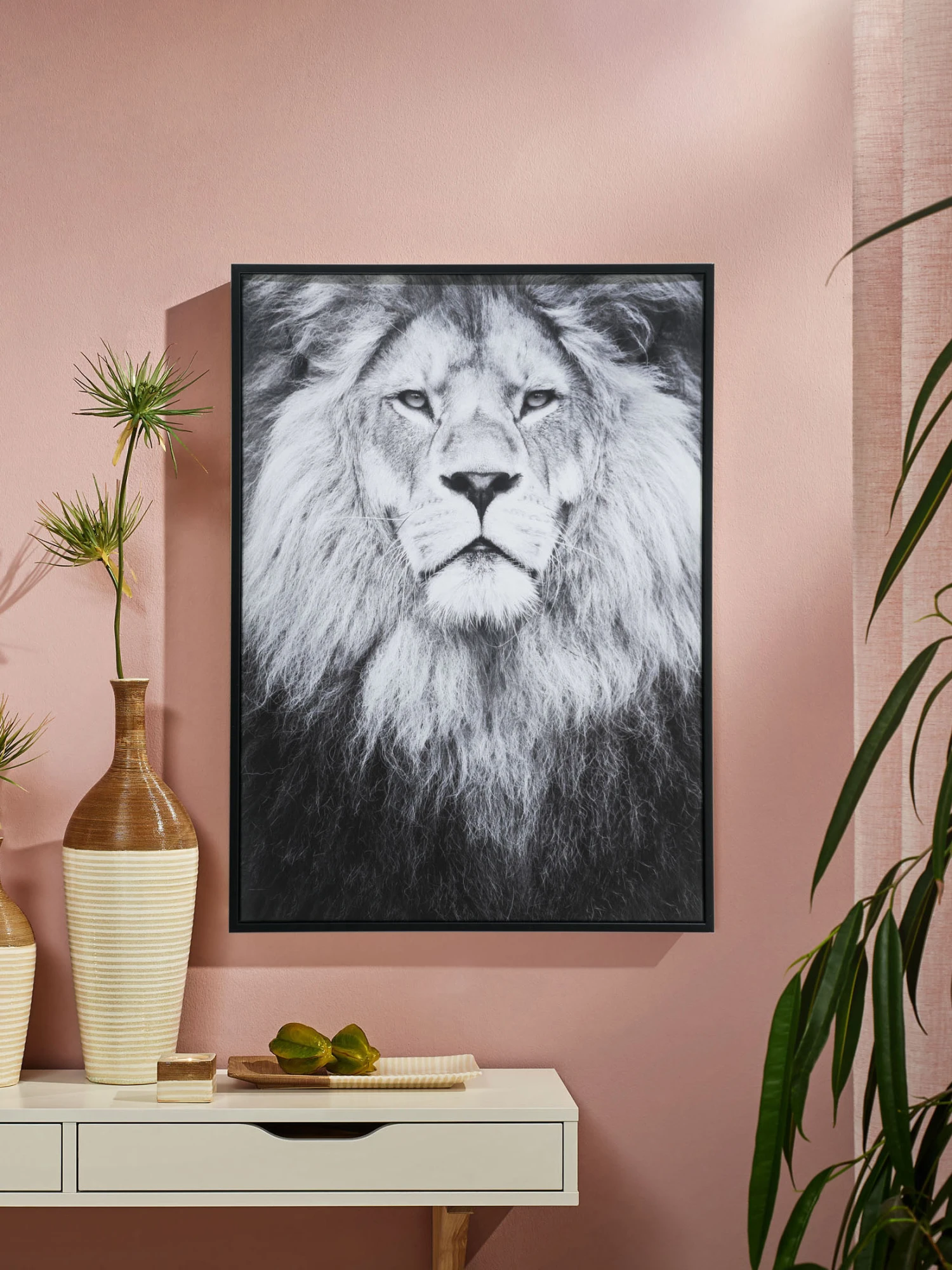 Der König der Tiere! Ganz majestätisch blickt KING LEO aus seinem Rahmen. Der Fotodruck ist hochwertig und edel in schwarz weiß grau gehalten. Inklusive Aufhängung. Der Rahmen ist schon dabei.