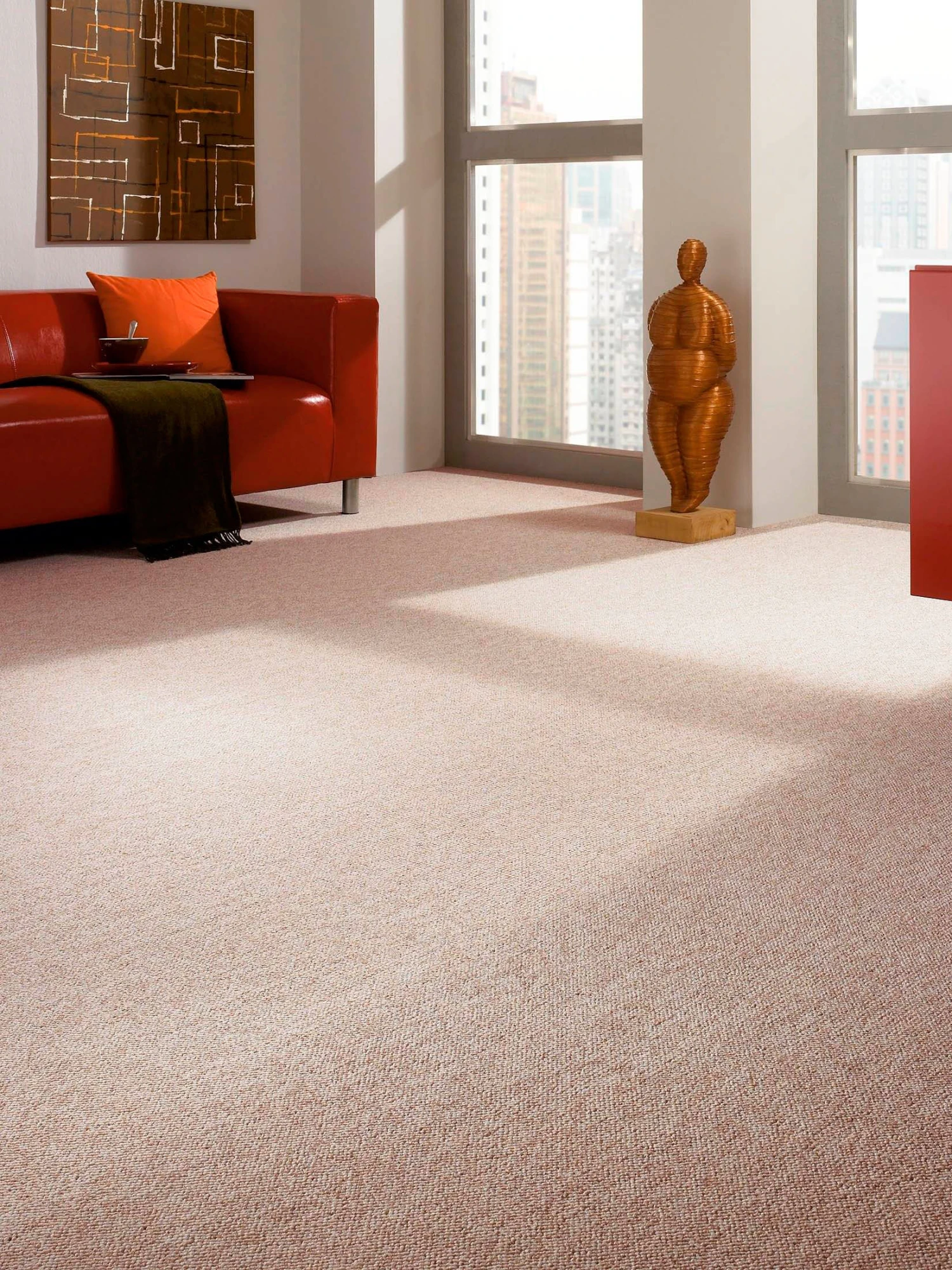 Für den robusten Einsatz eignet sich dieser feste Schlingen-Teppichboden genauso wie für Räume mit weniger Beanspruchung wie z. B. dem Schlafzimmer. Der SCARLET hat ein hohes Qualitätsniveau, was sich auch in seiner antistatischen Ausrüstung ausdrückt. Er ist auch für die Verwendung in Räumen mit Fußbodenheizung geeignet. Sein Gesamtgewicht beträgt ca. 1700 Gramm pro Quadratmeter, und er hat eine Florhöhe von ca. 5 Millimetern. Preise pro m². Flor 100 % Polypropylen.