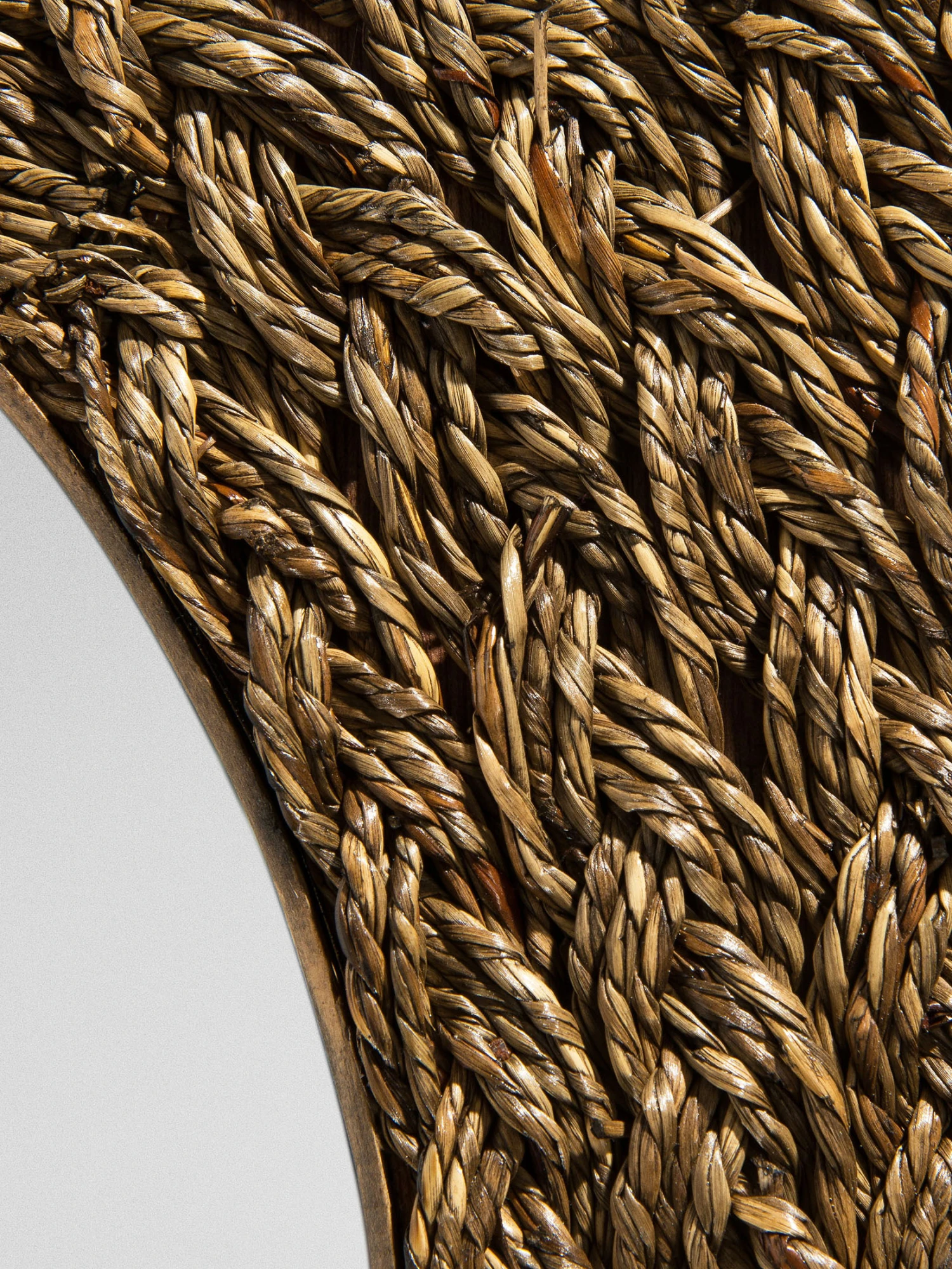 Kunstvoll gestalteter Wandspiegel mit geflochtener Rattanumrahmung. Mit Aufhängung.